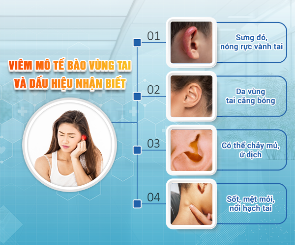 - Tai sưng đỏ: Có thể sưng cả vành tai hoặc khu vực xung quanh