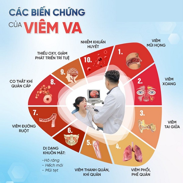 - Nhiễm trùng lan rộng: Viêm VA là ổ nhiễm khuẩn tiềm tàng có thể lan sang các cơ quan lân cận như xoang, phổi, gây ra các bệnh lý nghiêm trọng hơn như viêm xoang, viêm phế quản hoặc viêm phổi.